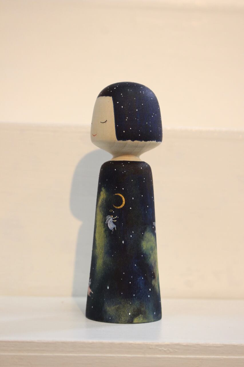 彼女はまるで宇宙そのもので 木地 : 津軽系伝統こけし工人 小島利夏 着彩 : 水彩絵の具 高さ : 約 11.5cm ※水彩絵の具での着彩の為、濡れた手で触ったり、水滴などが付くとにじみや掠れなどが生じます。水気には充分ご注意ください。