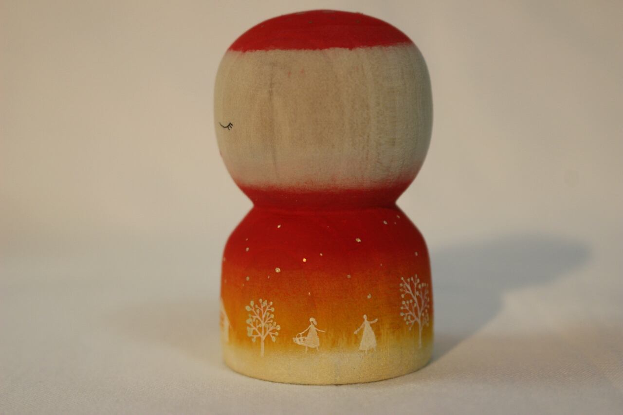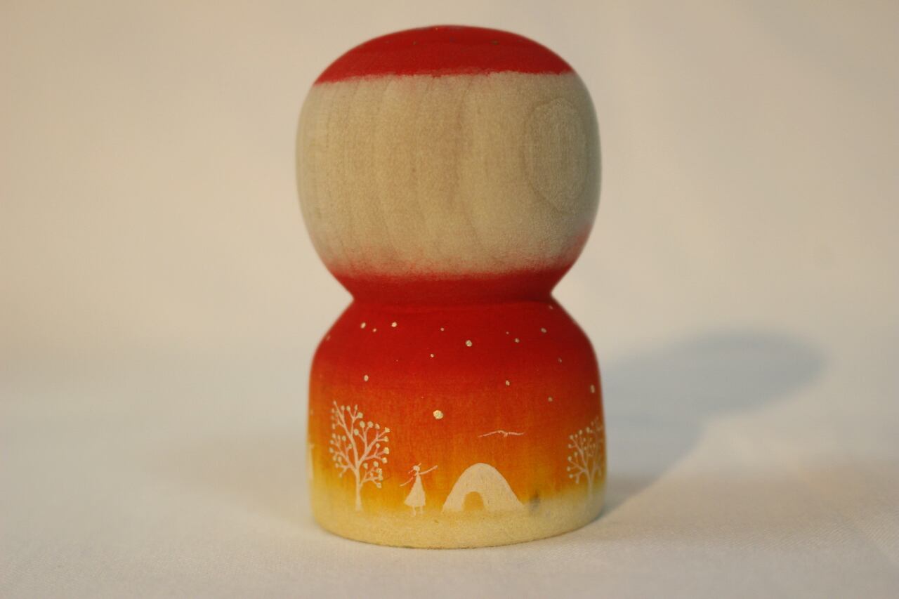 あったかくてさむっくってやわらかい 木地 : 肘折系伝統こけし工人 吉野誠二 着彩 : 水彩絵の具 高さ : 約 6cm ※水彩絵の具での着彩の為、濡れた手で触ったり、水滴などが付くとにじみや掠れなどが生じます。水気には充分ご注意ください。
